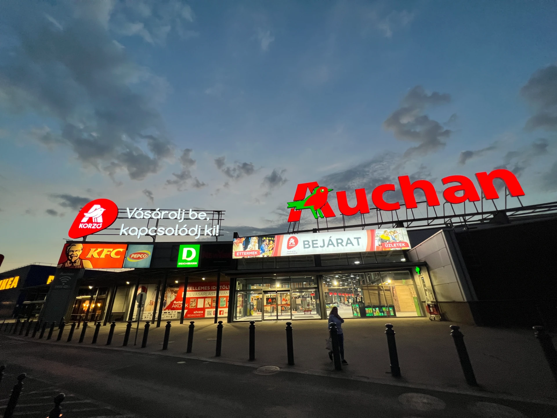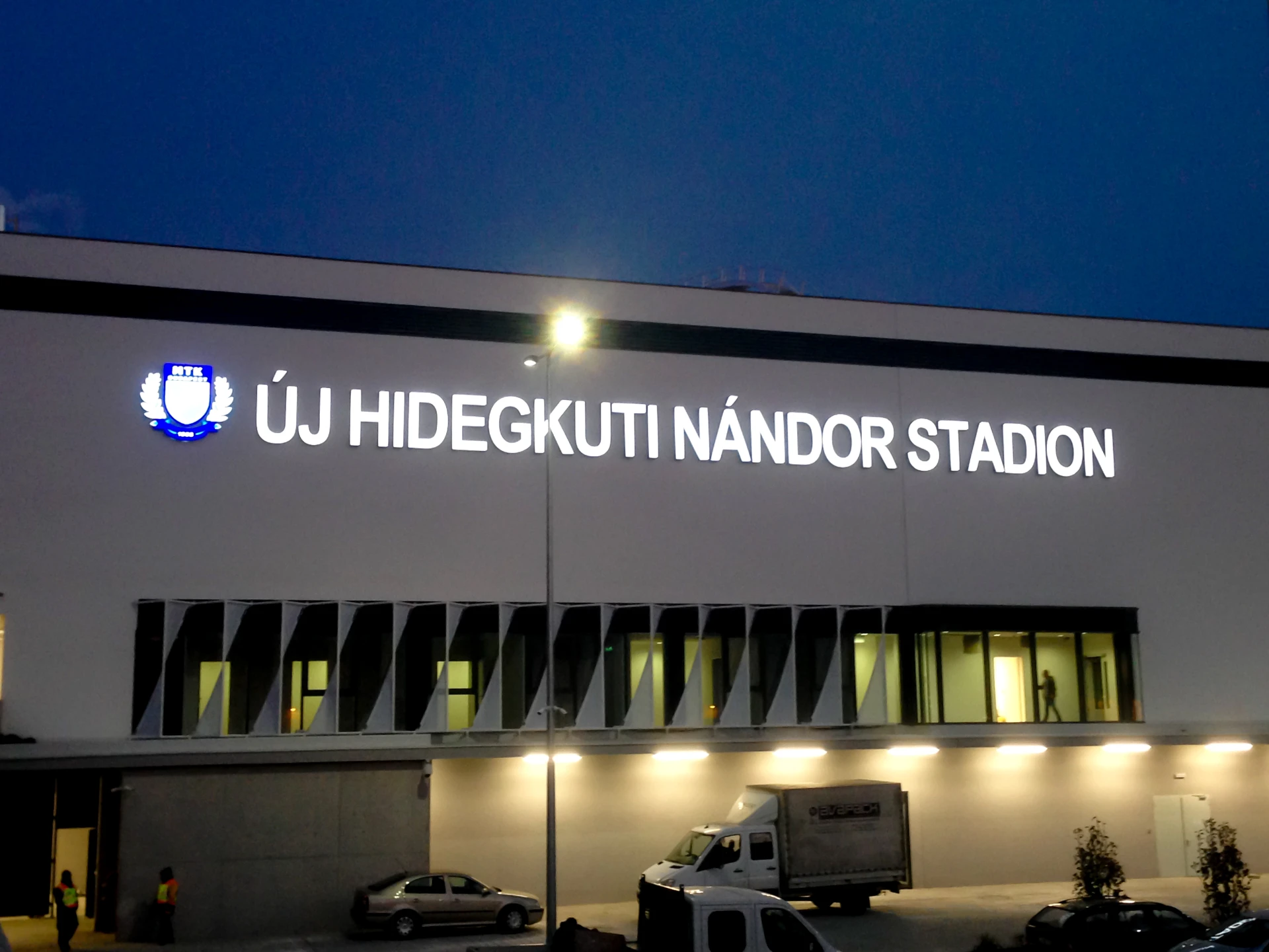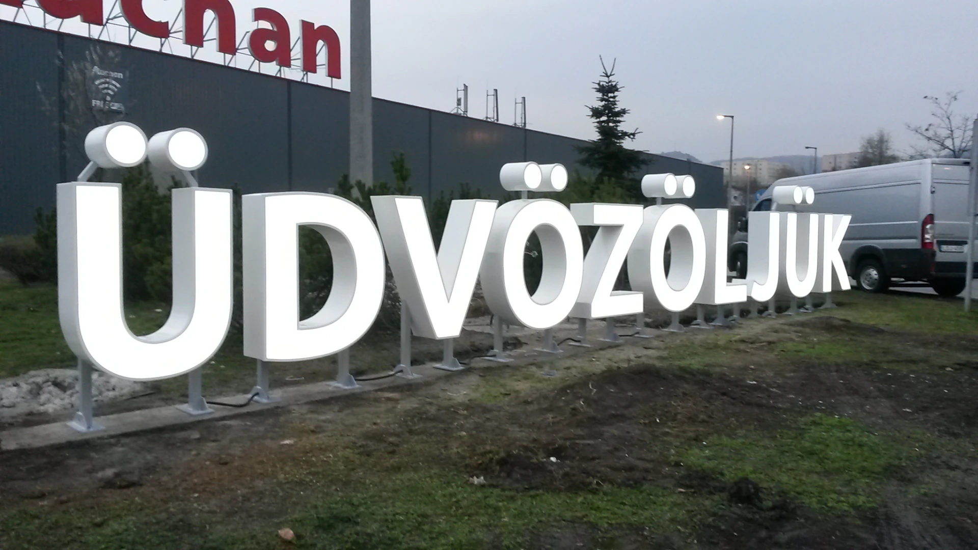 Profil 10. Plasztikus betűk, az előlap átvilágítható plexiből, a betű palástja időjárásálló PVC. Előre világít.